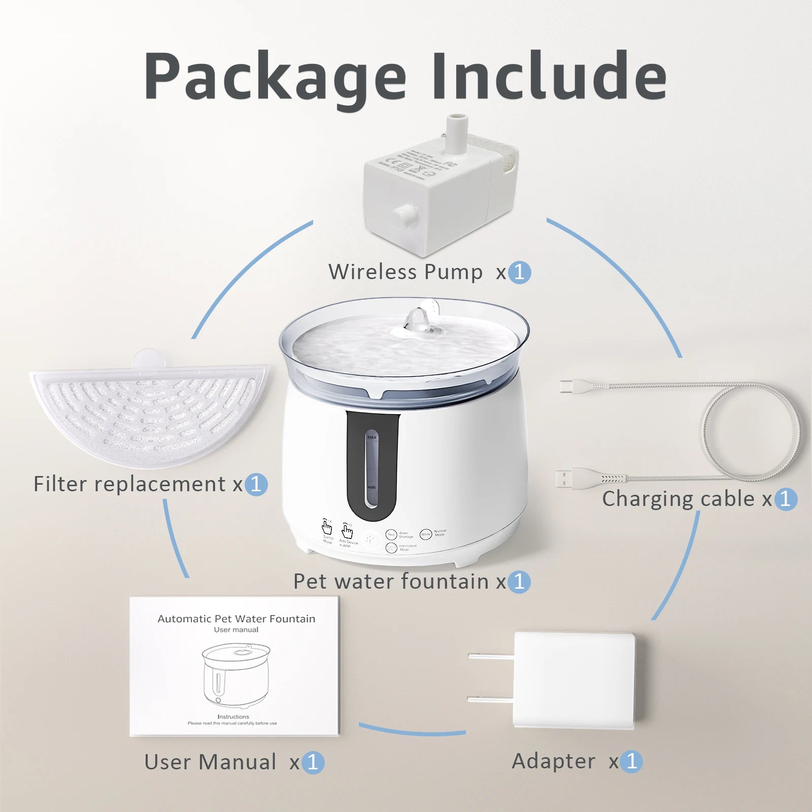 Updated Wireless Pump:The wireless pump has no cords dangling in the water to risk electrical shock to your pet. It makes the fountain easy to clean, no sharp edges or angles to clean around. In the mean time, the water tank and power supply base is separated, adding and replacing water are no longer a headache. *NOTE: The water fountain is wall-powered. Only the water pump is wireless