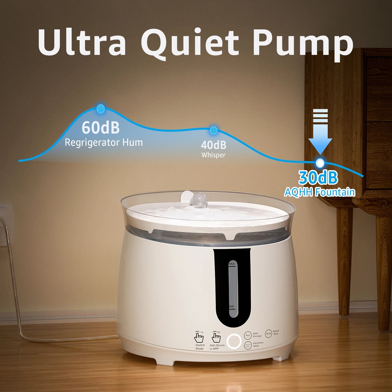 Ultra-Quiet Motor:Our cat fountain designed to re-address low noise level, even you put it in your bedroom, you can have sweet dreams, the entire fountain keeps within a barely audible noise 30db, which is quieter than a whisper