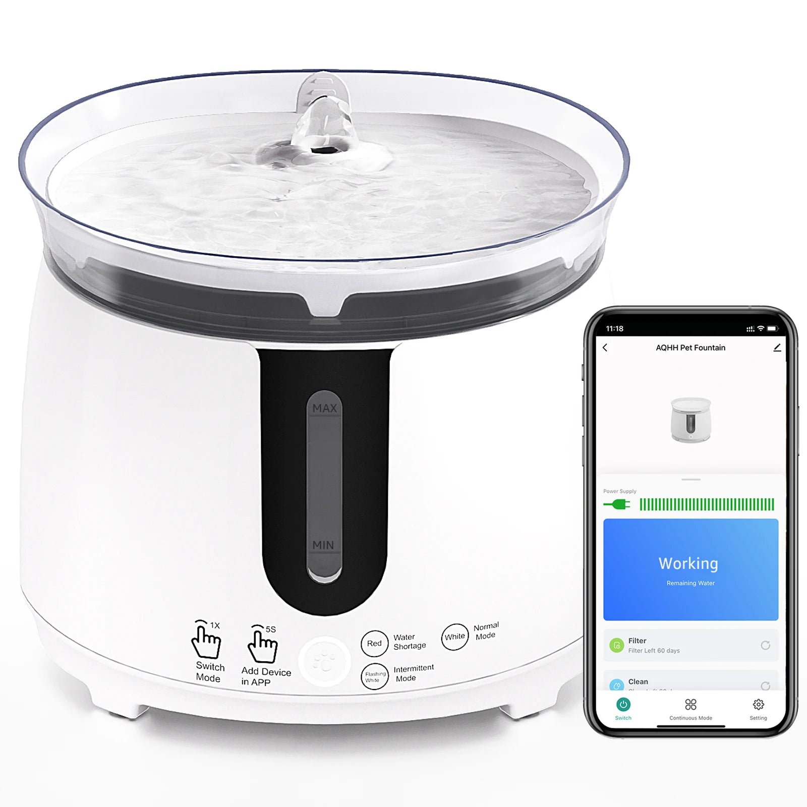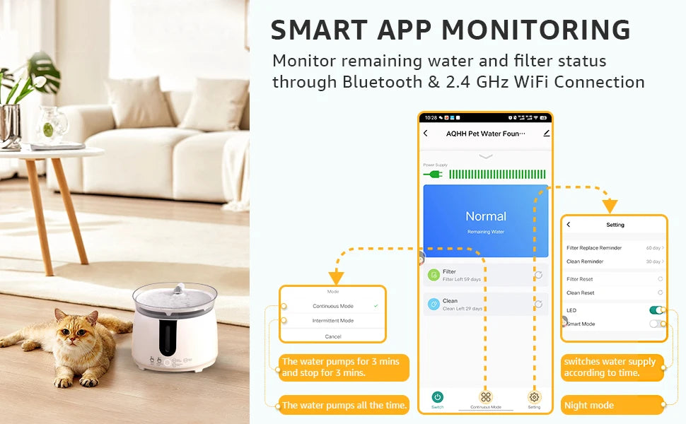 Convenient App Control:Turn on Bluetooth and connect WiFi, you can switch automatic cat water fountain on and off, switch the water supply mode, turn on and off the indicator light, receive water shortage reminders and filter replacement reminders. Please note the device only supports in 2.4 GHz WiFi
